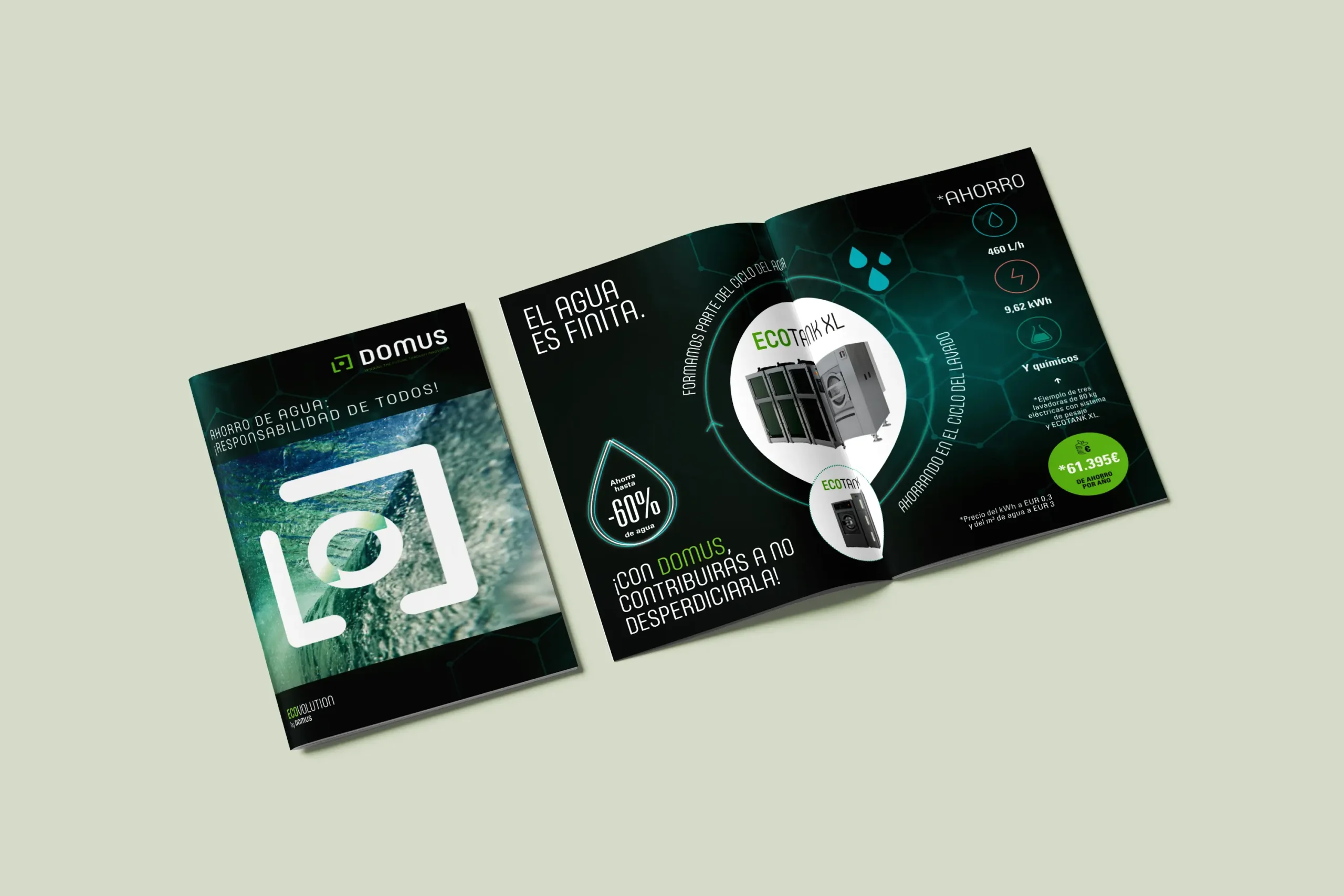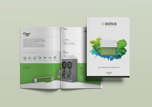 Domus, referente en España y con proyección internacional, ofrece soluciones de lavandería industrial y autoservicio. Para sus catálogos y materiales editoriales introducimos una explosión de pintura en verdes y azules que evoca el proceso de lavado. Un recurso visual que asocia el verde con eficiencia energética y el azul con limpieza y cuidado, creando una identidad distintiva y memorable que potencia el posicionamiento de la marca.