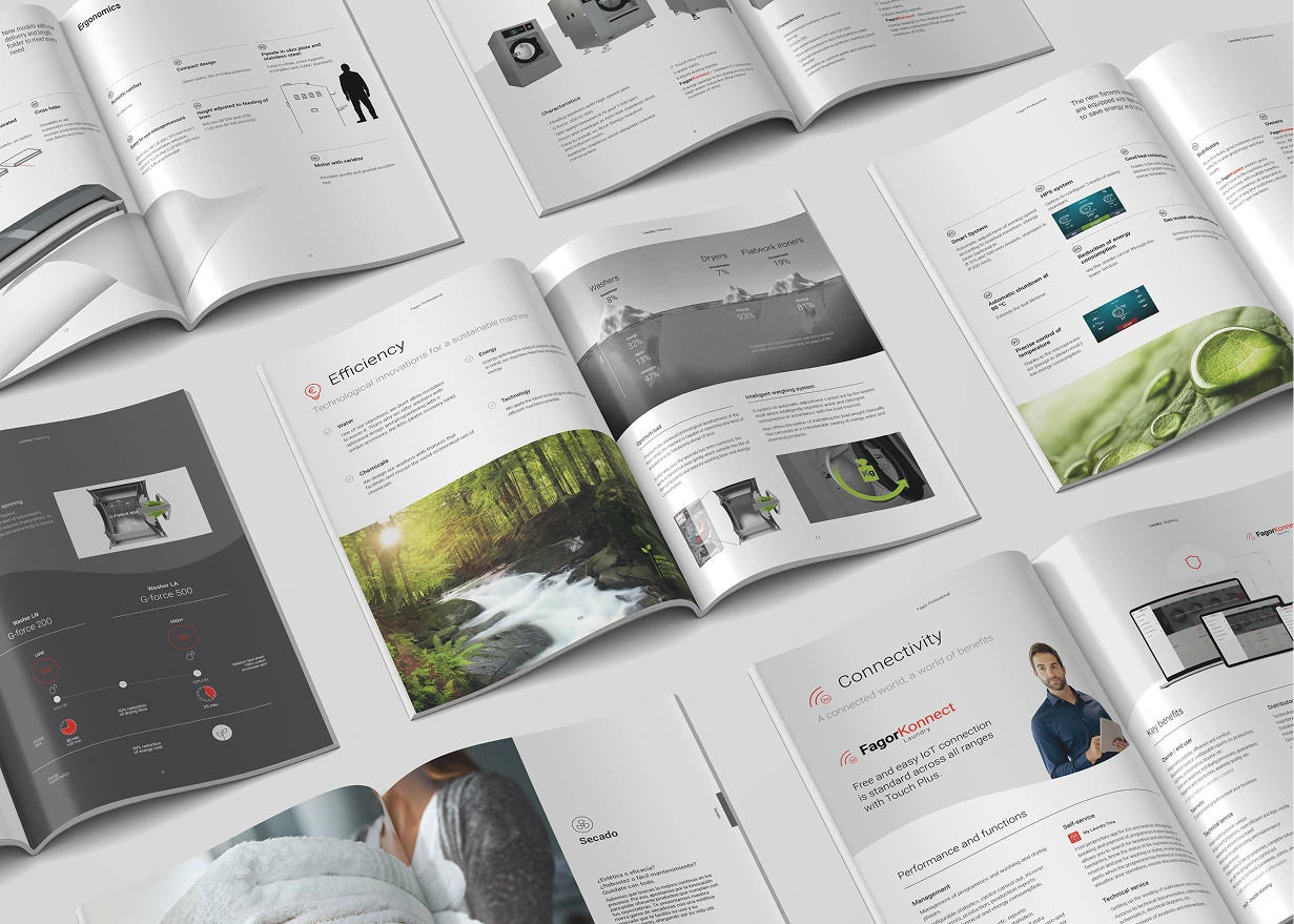 Fagor es una marca consolidada, reconocida y pionera en el sector, con una trayectoria que combina calidad y tecnología en sus soluciones de lavandería profesional. Entre sus diversas divisiones, centramos nuestro trabajo en la industrial, donde desarrollamos proyectos de diseño que reflejan esta unión entre excelencia técnica y avance tecnológico. Los catálogos y soportes editoriales creados traducen estos valores en un diseño limpio y estructurado, con recursos visuales que ponen en valor la robustez y conectividad de sus equipos y transforman su liderazgo industrial en una imagen coherente y contemporánea.